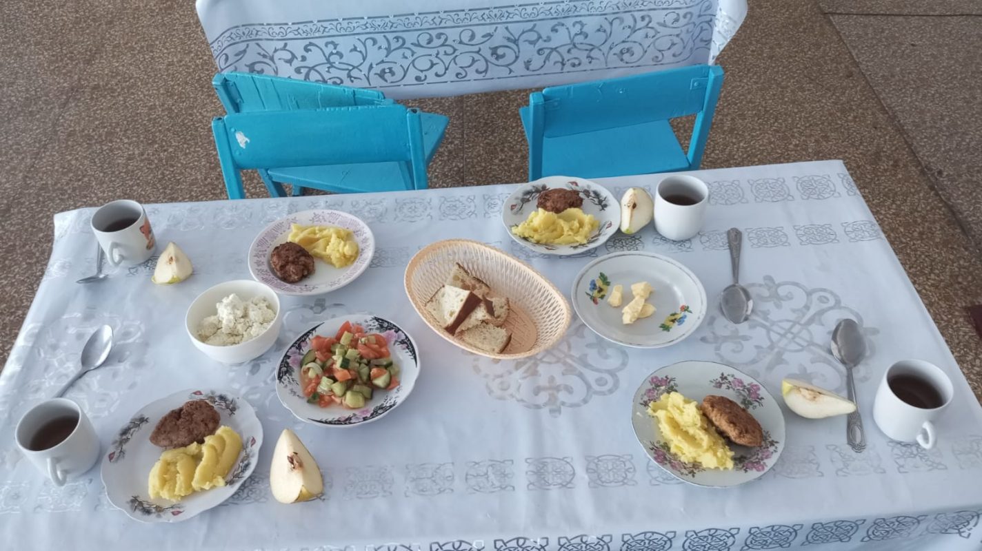 Салат из помидоров и огурцов Картофельное пюре Рыбная котлета Груша Сок натуральный Творог, мед Хлеб с маслом